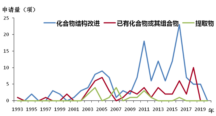 从趋势上看,抑制冠状病毒活性的化学药专利申请量与2003年SARS,2009年甲型H1N1流感疫情、2012年中东暴发MERS疫情、2015年韩国暴发MERS疫情呈正相关。开发已有化合物或其组合在抑制冠状病毒方面用途占26.7%,即“老药新用”这一创新思路贯穿于整个技术发展过程中。