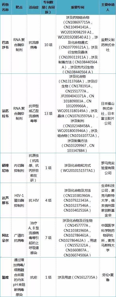 基于此,报告对于治疗药物重点对上市药新适应症、已进入临床试验的在研药以及体外试验证明有效的在研药进行研判,从RNA阻断、囊膜阻断的机理两大方向开展,对7种老药新适应症,3种临床试验在研药,例如瑞德西韦、匹莫地韦,和多种对冠状病毒有明显抑制作用的在研药在专利信息中披露出的数据进行筛选。